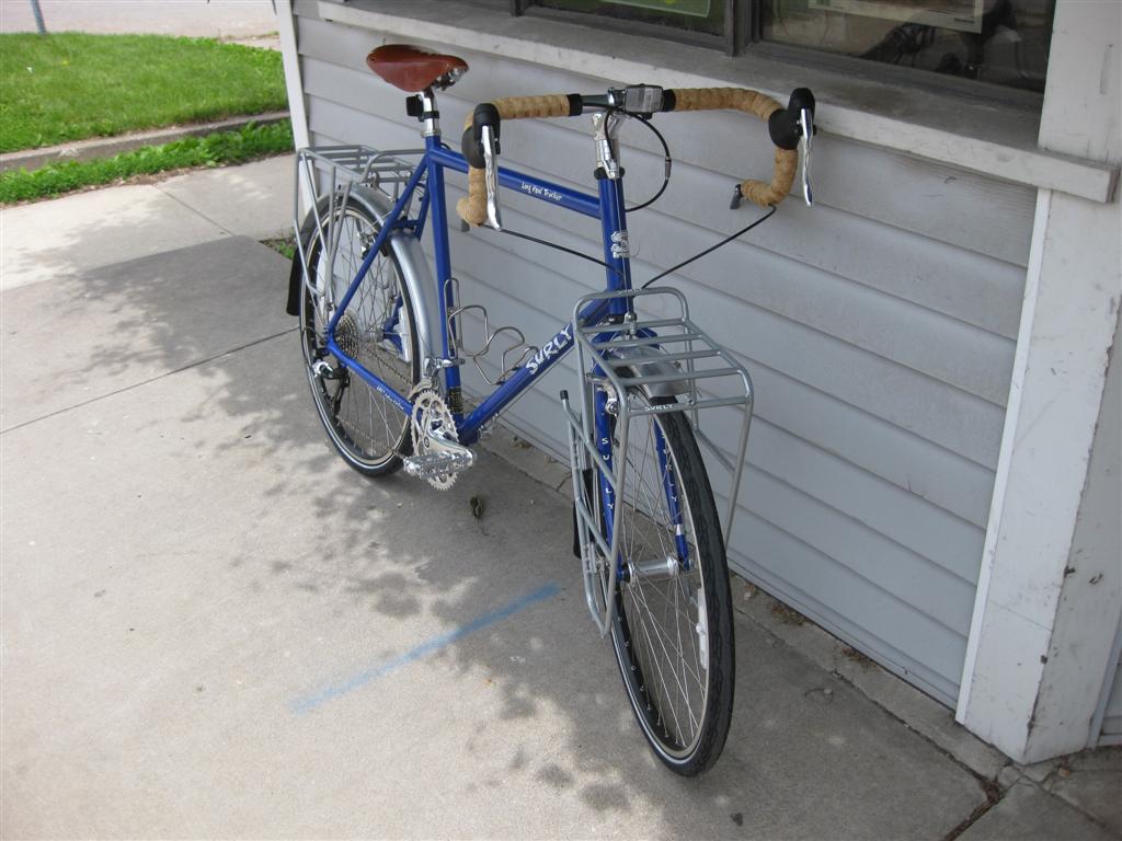 It has been equipped with Surly Nice Racks(front & rear), a Brooks B-17 saddle, Cinelli Gel cork handlebar tape, MKS touring pedals, & Planet Bike Cascadia fenders which have been upgraded with SKS front break-away mounts.