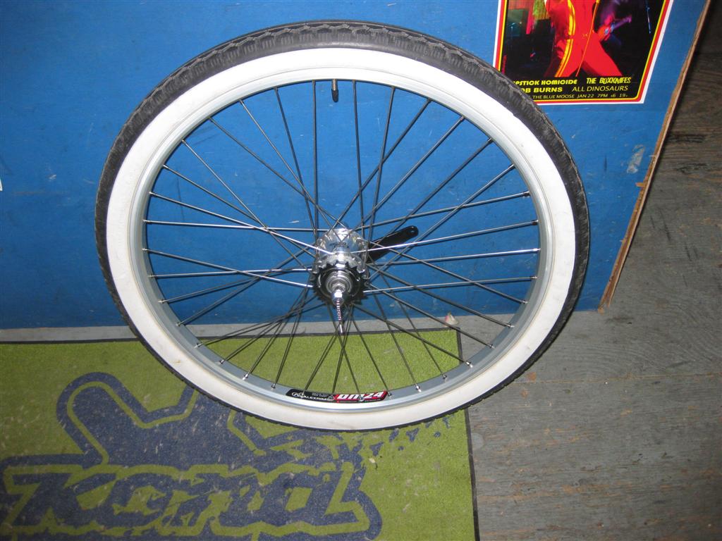 The first is a Sturmey-Archer internal three speed coaster brake hub laced up to an Alex DM24 rim with DT Champion spokes.