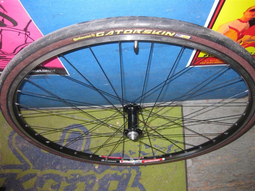 Here is the front wheel that I hand-built to match the rear that I built weeks ago. Paul WORD hub on an Alex Adventurer rim using Wheelsmith double butted spokes. Continental Gatorskins put the rubber to the road.