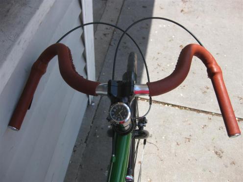 Hand-stitched(by me) Velo Orange Elk hide handlebar covering give the handlebars an elegant look. The Stem Captain clock in the stem adds functional class!