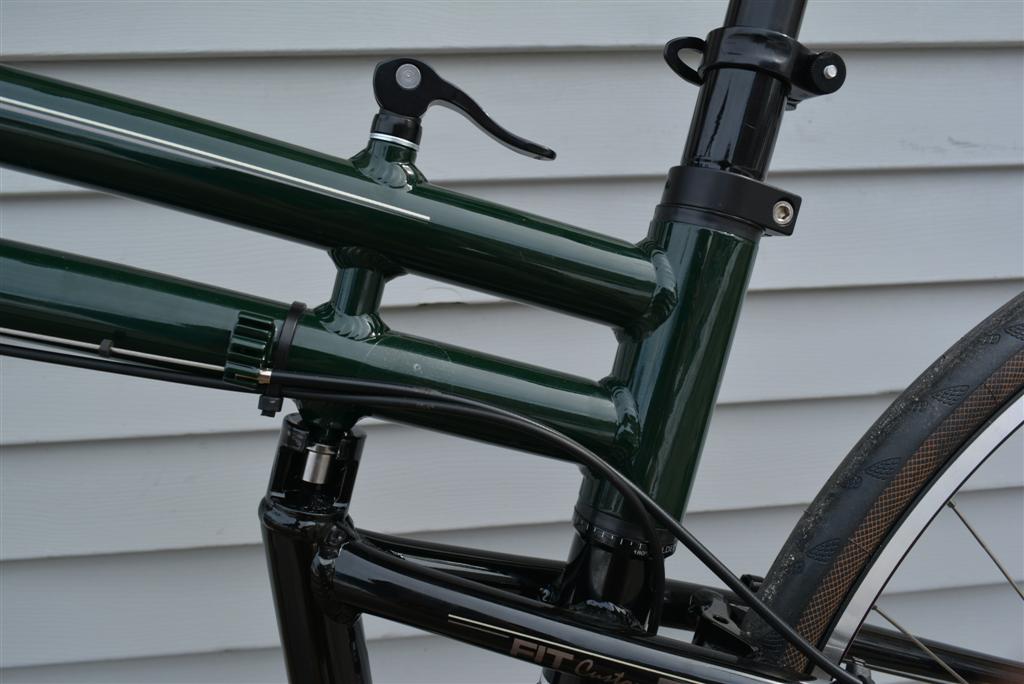 This is a custom frame up build of a Montague FIT full-size folding frame. It basically has a quick release lever that allows the bike to fold in half horizontally along the seat tube.